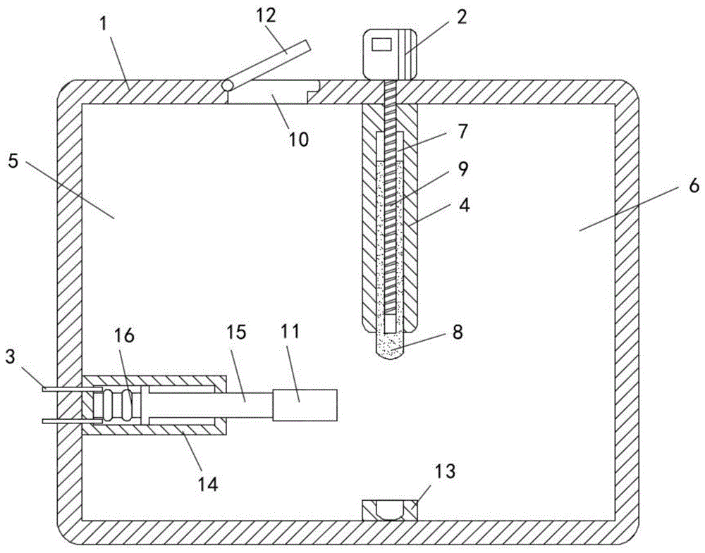 本實(shí)用新型中,擋板4內(nèi)設(shè)有下端開口設(shè)置的滑槽7,滑槽7內(nèi)滑動(dòng)連接有滑動(dòng)板8,值得一提的是,殼體1的內(nèi)底面上設(shè)有墊圈13,避免滑動(dòng)板8向下移動(dòng)至撞擊殼體1內(nèi)側(cè)壁造成損壞,墊圈13由有機(jī)硅橡膠材料制成,耐熱性能好,滑動(dòng)板8內(nèi)螺紋連接有螺紋桿9,螺紋桿9的上端依次貫穿滑動(dòng)板8、擋板4和殼體1并延伸至殼體1外設(shè)置,螺紋桿9的上端電機(jī)2的輸出軸固定連接,可將抽真空腔5和熱處理腔6密封隔離,防止熱處理腔6內(nèi)的真空消失和熱量逸散,有效的節(jié)約了能源,降低了生產(chǎn)成本。